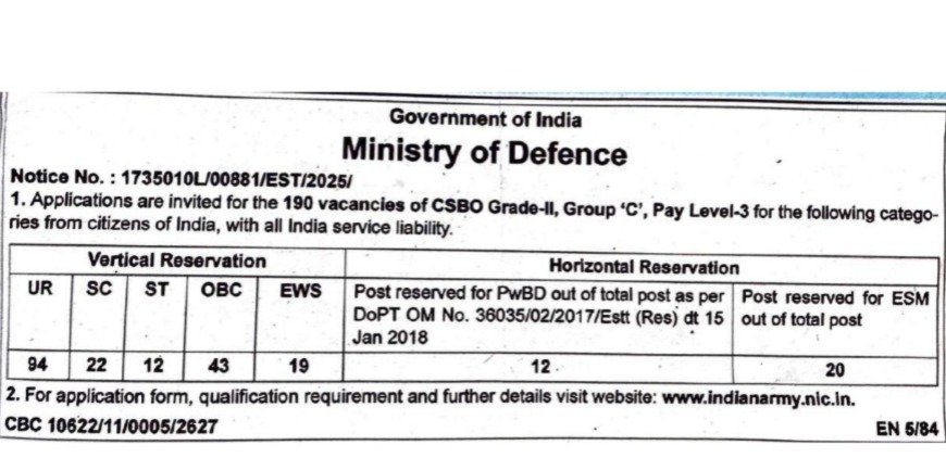 Indian Army CSBO Grade II Group C Recruitment 2026 – भारतीय सेना (Indian Army) ने साल 2026 में CSBO Grade-II (Civilian Switch Board Operator) के पदों पर बड़ी भर्ती का नोटिफिकेशन जारी किया है। इस भर्ती के तहत कुल 190 पदों पर उम्मीदवारों का चयन किया जाएगा। यह भर्ती Group C के अंतर्गत आती है, जिसमें देश के सभी राज्यों के उम्मीदवार आवेदन कर सकते हैं।Indian Army CSBO Grade II Group C Recruitment 2026